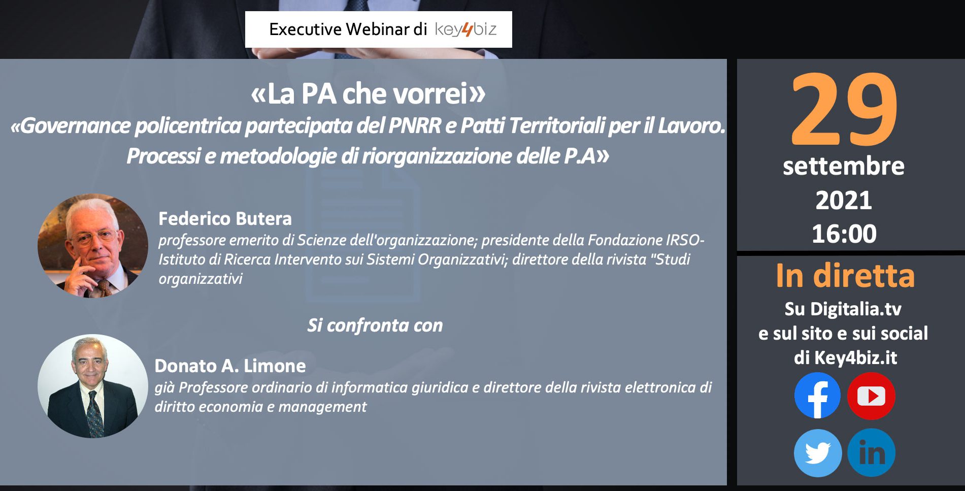 Tema della puntata: “Governance policentrica partecipata del PNRR e Patti Territoriali per il Lavoro. Processi e metodologie di riorganizzazione delle P.A.”