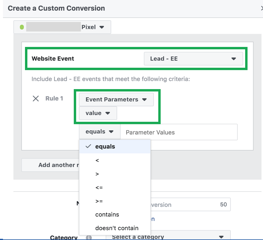 In order to create a custom conversion, the example changed the Website Event to the conversion action and then changed the Rule to Event Parameters > value. The rules were then setup for different employee counts.