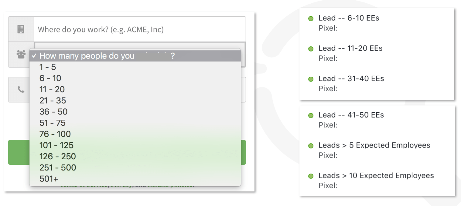 The company’s website had a sign-up form that provided a drop-down for users to input the number of employees they expected to manage with the tool (i.e. the more employees, the more money the company makes). This was used to leverage custom event audiences detailed below.