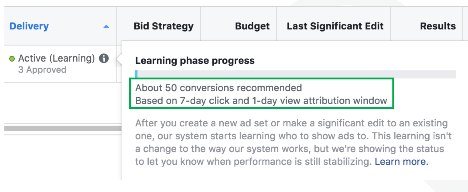 - Ideally, you should shoot for 50 conversions per ad set per week