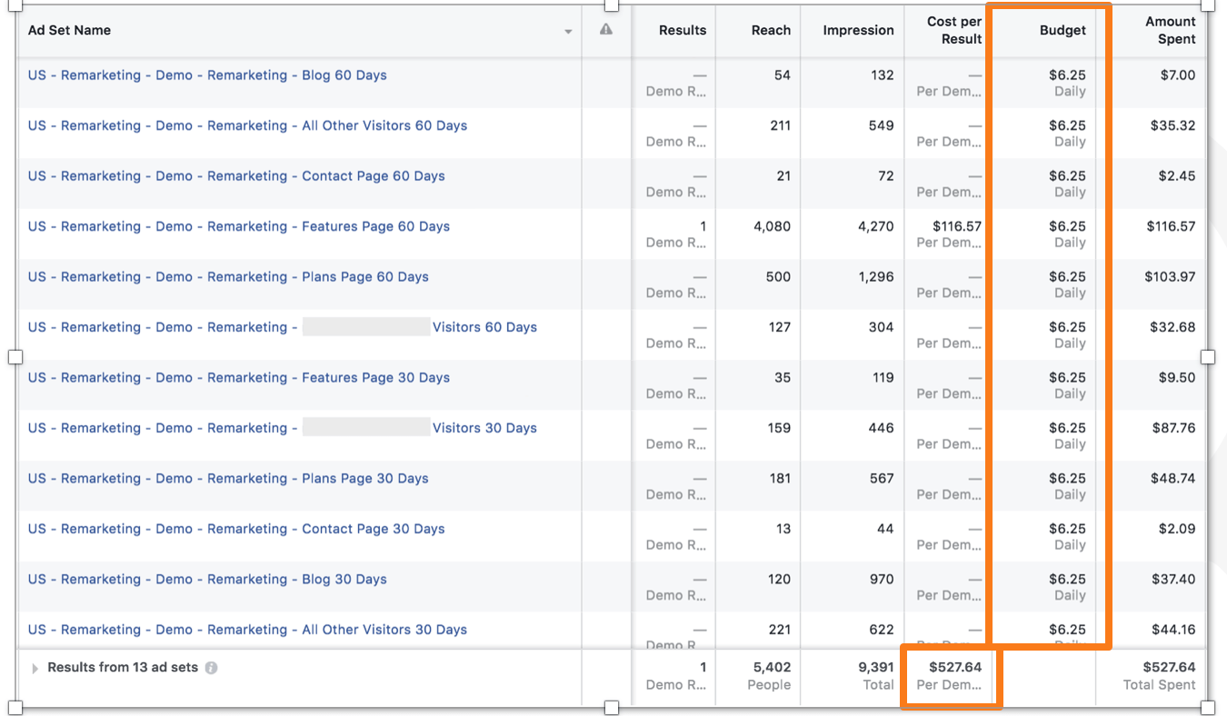 When it comes to budgets you want to consider not segmenting your budget too much. Here’s an example of an audience-segmented campaign that, from a high level looks great with a daily budget of $82.25 per day, unfortunately, it was segmented so much that each ad set only had $6.25 attributed per day.