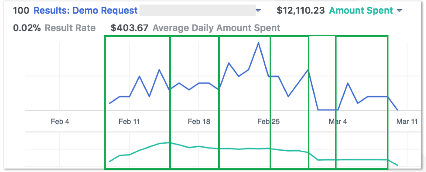 Budget trend line: The top line is conversions, the bottom line is daily spend. As the budget scaled up, Facebook was also scaling up with conversions. Campaigns were then pulled back based on budget restrictions which resulted in a small dip. The campaign was left alone after the decrease and it still ultimately gained increased conversions. Then the campaigns were pulled back drastically due to budget restrictions and the results tanked.