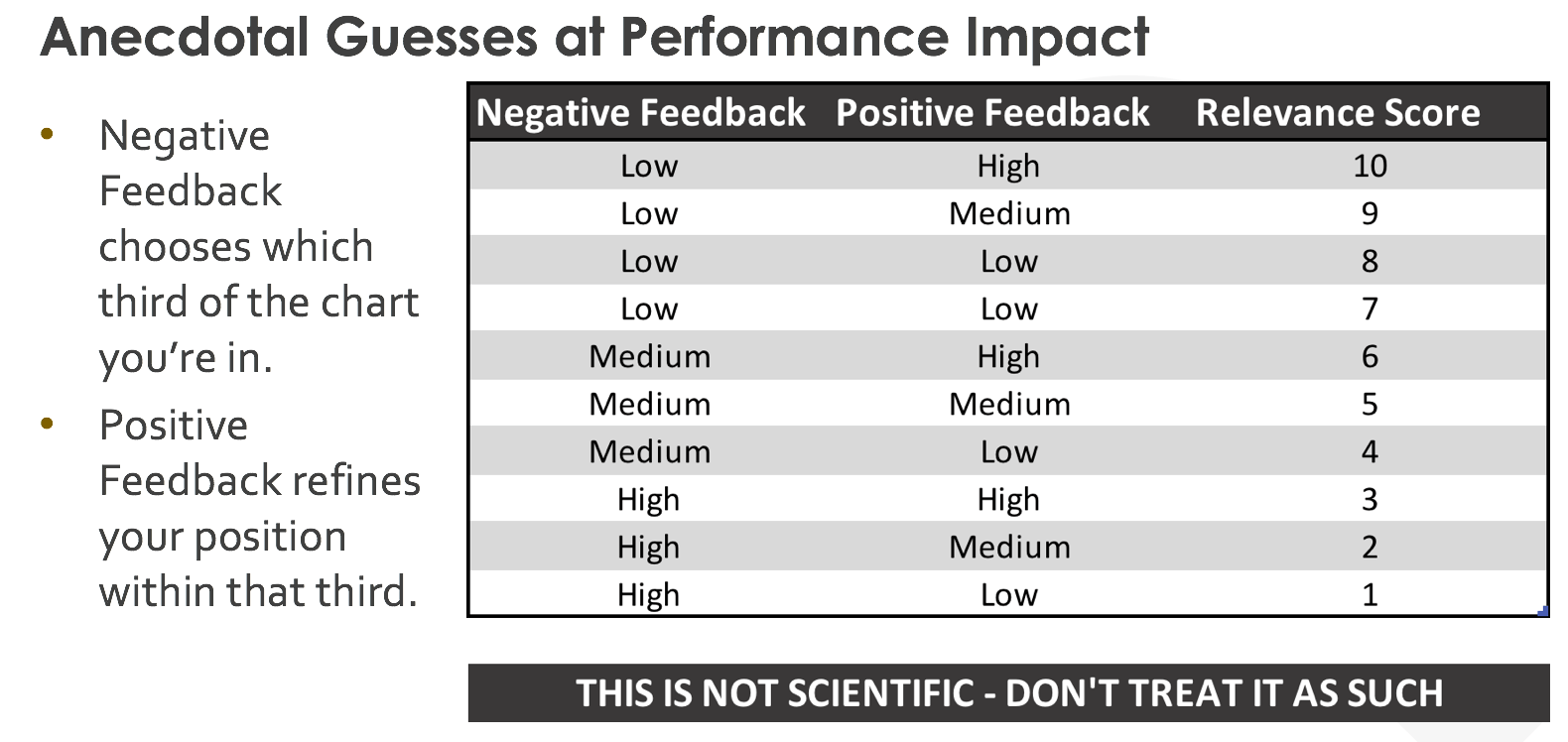 Relevance scores are based on how well your ad is performing as well as its positive feedback and negative feedback. However, it’s completely estimated based on only 500 impressions. Here’s an example of what it might look like (this is only to provide an idea: NOT SCIENTIFIC):