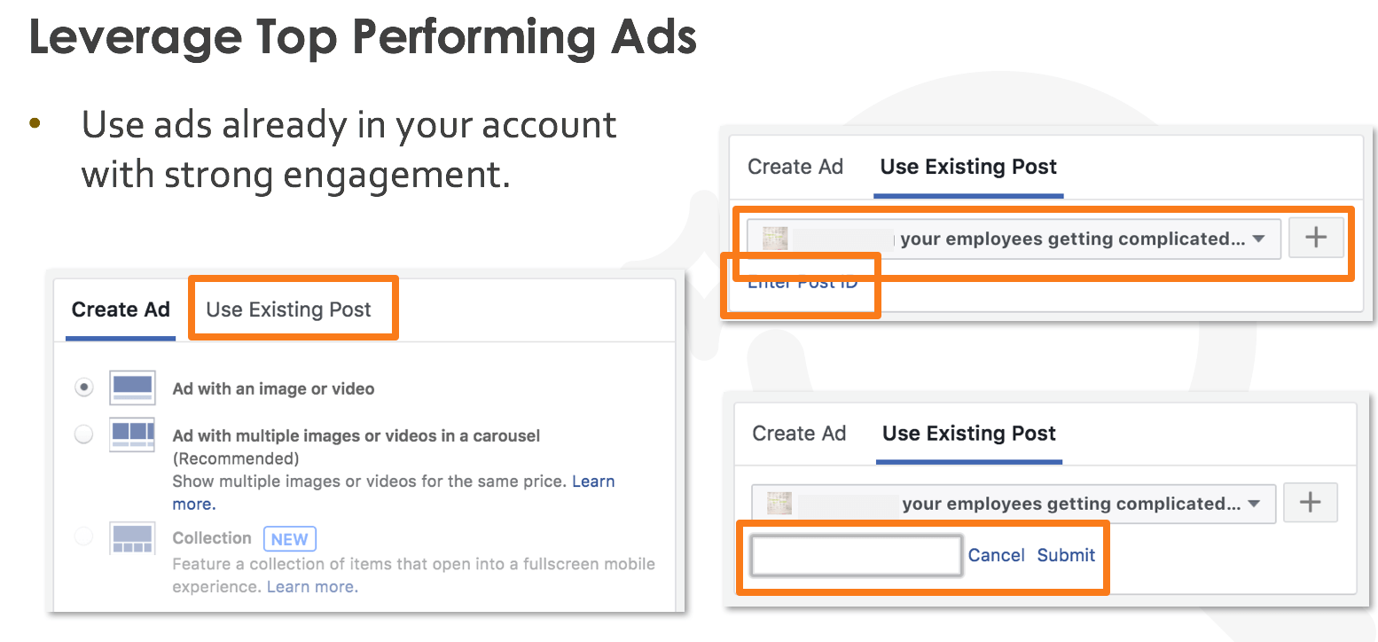 How to leverage positive feedback: You can use top-performing, existing posts in your ads by using the post ID or you can set up an engagement campaign, let it run for a few days and use those top performing post IDs.
