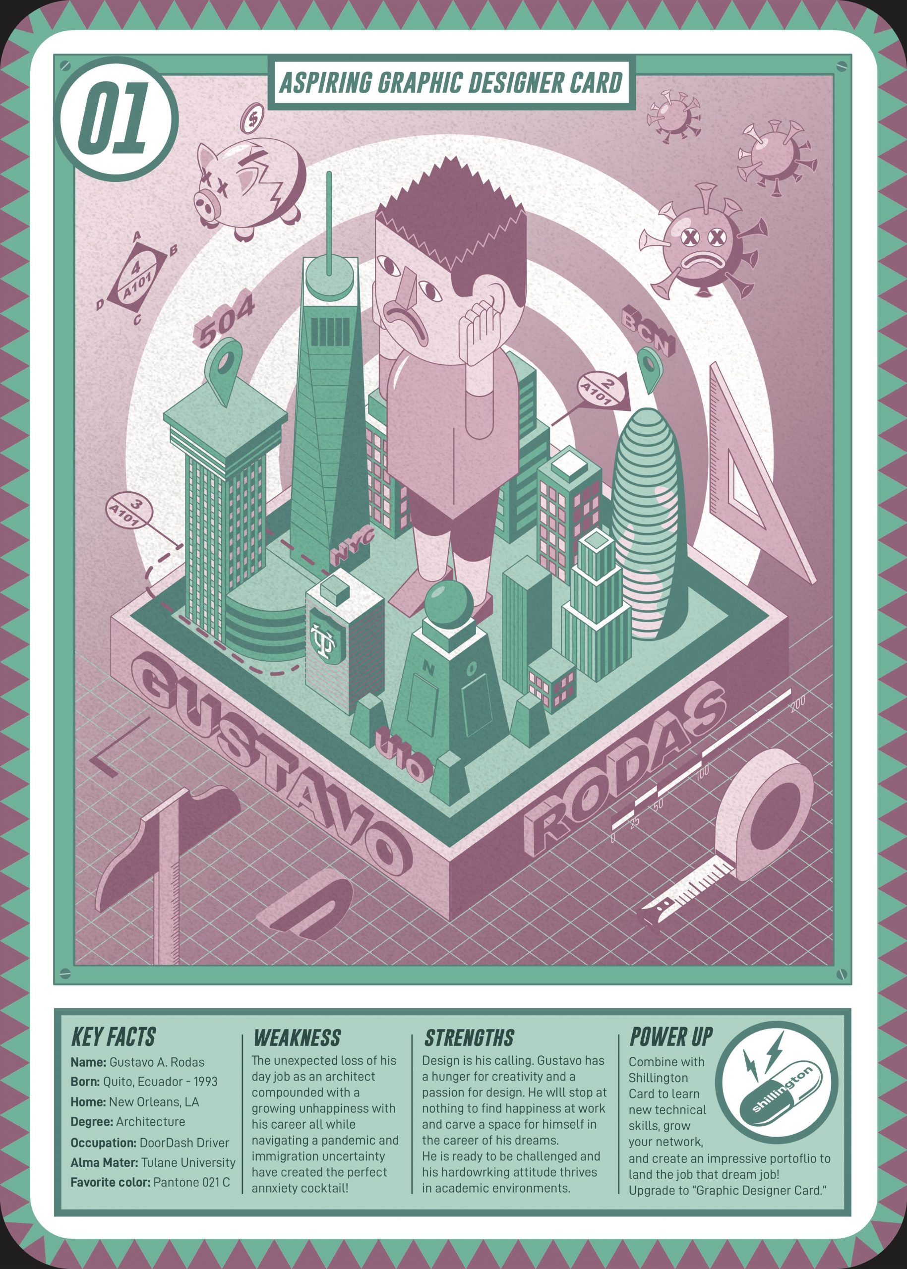 For my submission I wanted to learn a new skill and push myself to create an illustration which is something I hadn’t really done before, I learned how to create an axonometric illustration which I thought would be a cool way to combine an architectural technical drawing style with a more fun illustration style. The composition eventually turned into a self portrait that depicted my emotional state at the time. Like a lot of people, I was filled with anxiety about my job loss, and Covid, and that definitely was reflected in the piece.