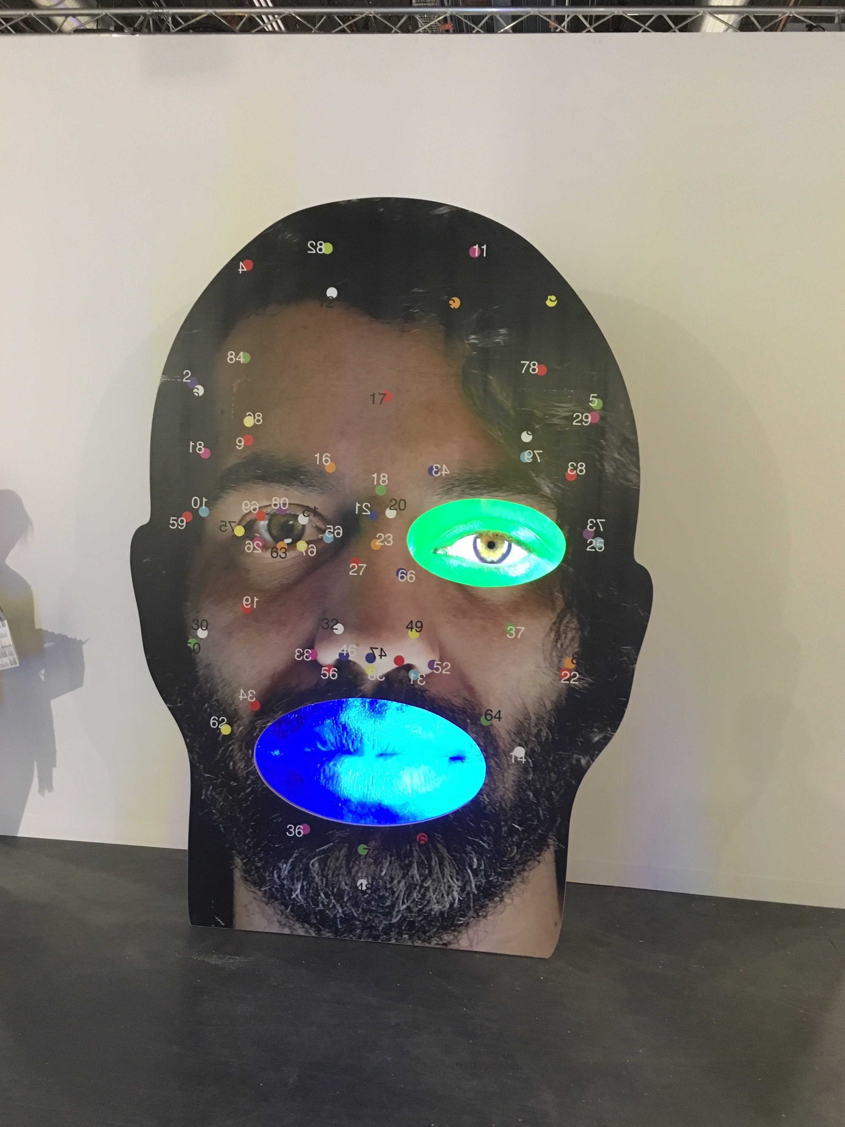 It’s an enjoyable exercise to wander the fairs and museums to seek out those who are engaged in the weird way our world is changing by using code, VR, short, trippy films, or by mining science fiction themes. One standout work was a fantastic older painting The Space-Time of the Dandelion by Matta, that was made in 1967. A more contemporary example is Tony Oursler’s video work that focuses on facial recognition employed through big data and surveillance programs.