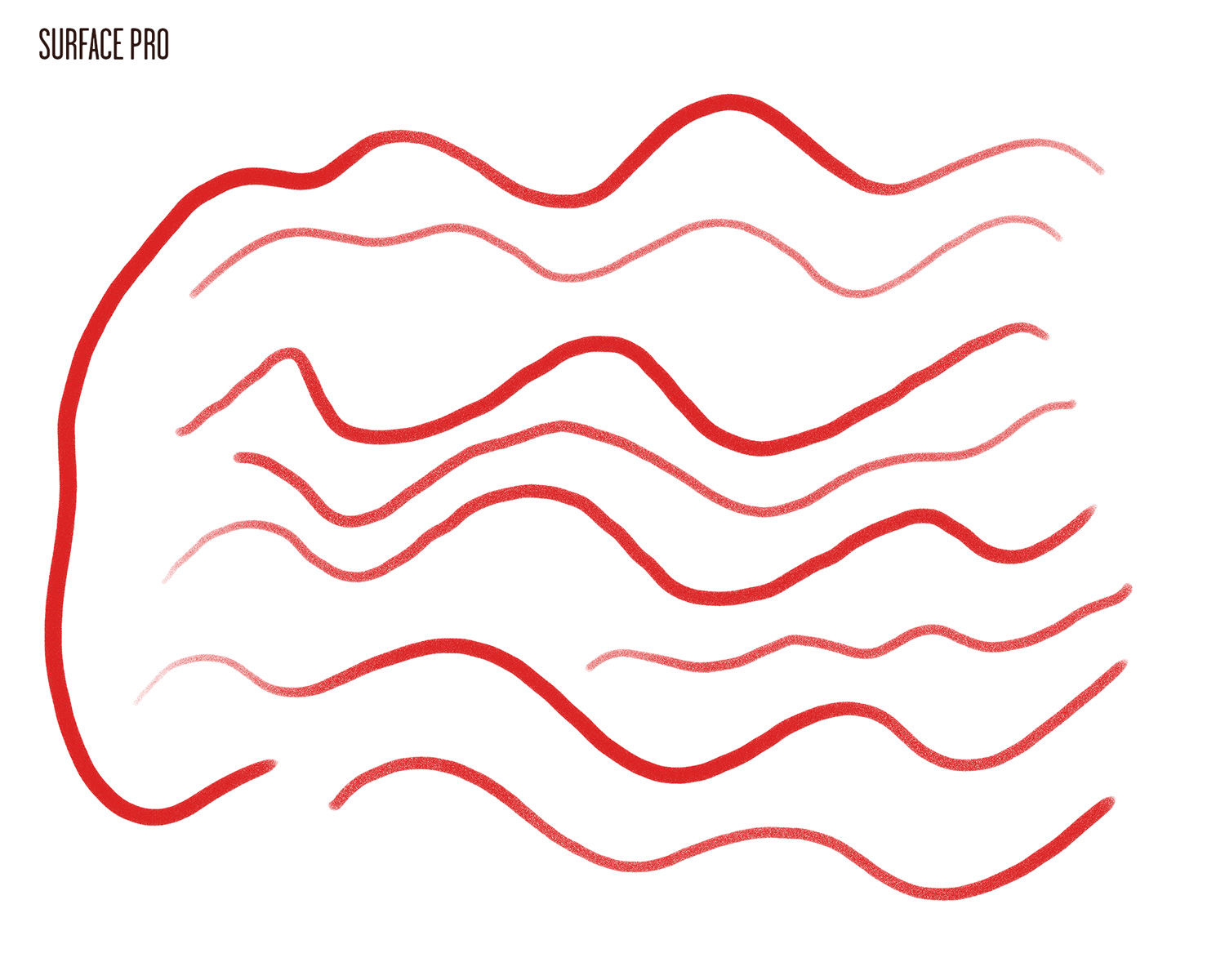 I did a simple comparison text between the iPad Pro and the Surface Pro, using the same brush by Kyle T. Webster in Adobe Photoshop Sketch on the iPad and Photoshop on the Surface. You can see the results here (the red example being the Surface Pro), and quite clearly see how the lines are noticeably ‘jittery’ on Microsoft’s device, whilst also showing far less variation in thickness, controlled by brush pressure.