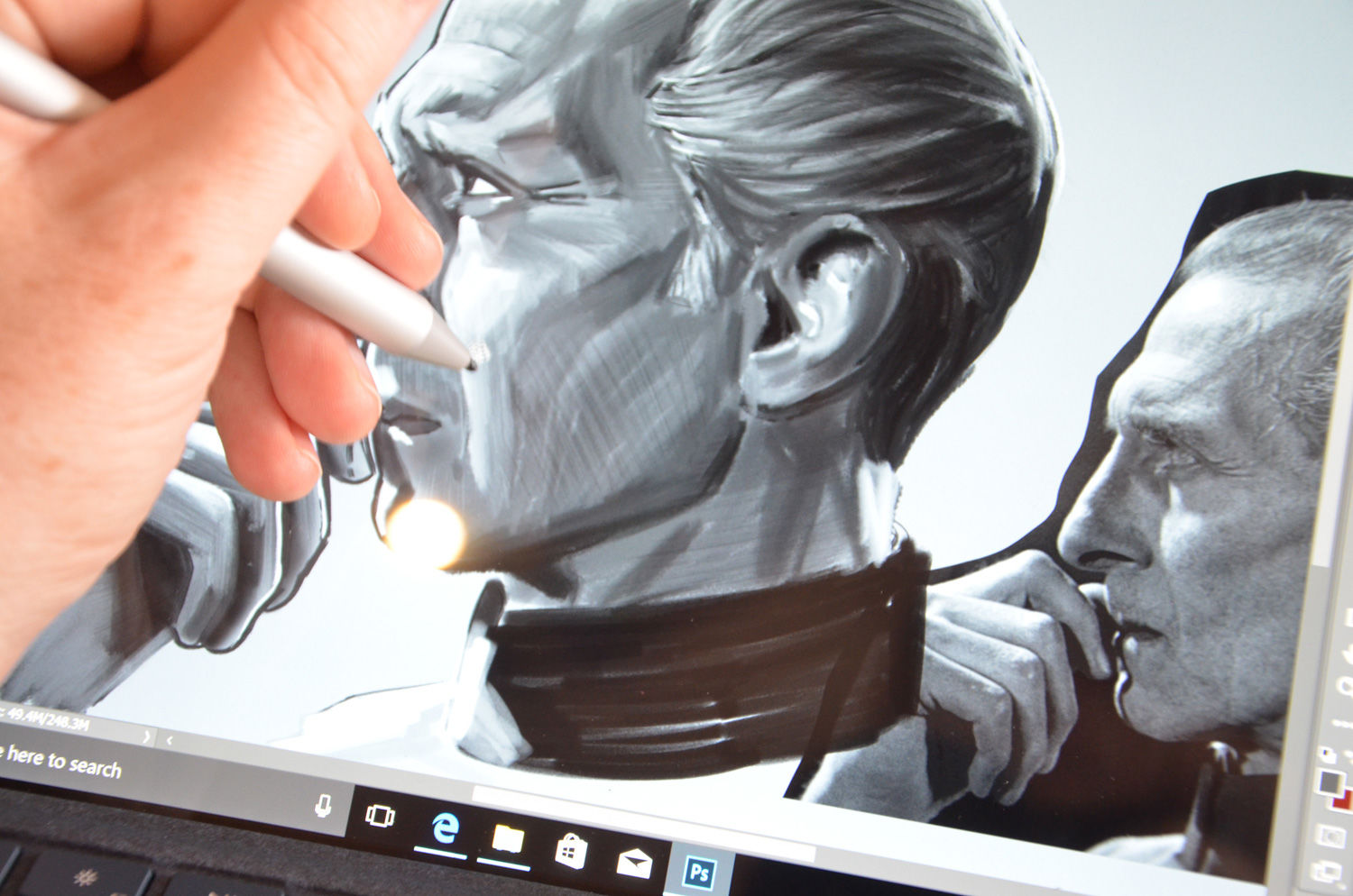 Before going into my thoughts on the Surface Pro, let me just explain my current setup as an artist. I spend the majority of my time working from home on my 5k iMac, drawing with a Wacom Intuos Pro. Over the last year or so the 12.9-inch iPad Pro has been introduced into my workflow, and I find that increasingly I’m starting new pieces on there before bringing them to my desktop for additional work and adjustments.