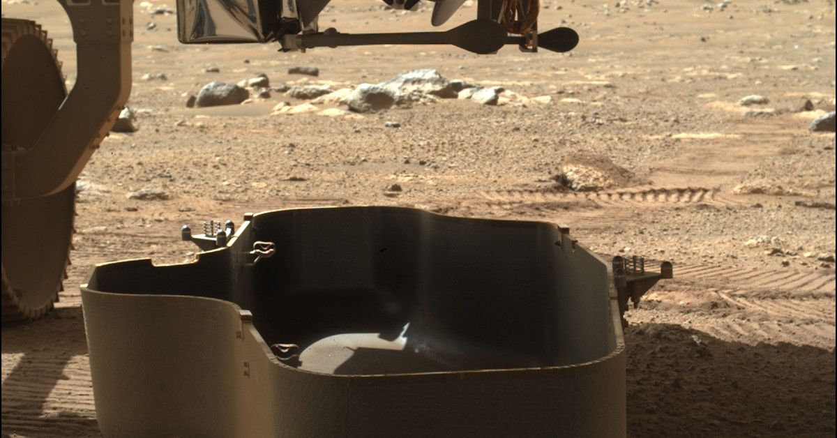 The craft is currently attached to the belly of Perseverance, which landed at Mars’ Jezero crater in February. One of the first steps toward setting the baby helicopter off on its debut flight came this weekend when Perseverance dropped a protective shell and exposed Ingenuity to the bright Martian sunlight for the first time. “Away goes the debris shield, and here’s our first look at the helicopter,” the rover’s Twitter account said on Sunday.