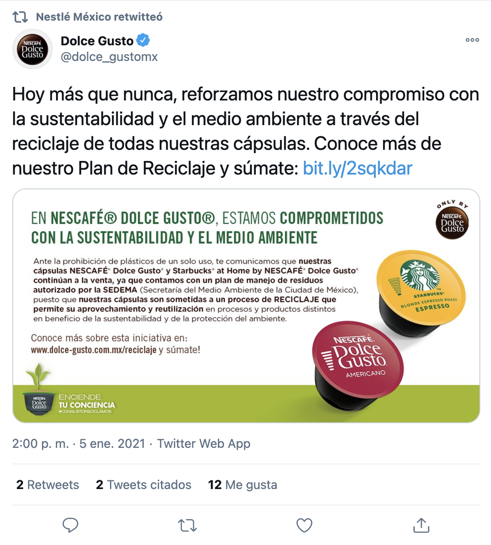 Although this year the sale of single-use plastics, which includes coffee capsules, was denied, the Secretariat of the Environment (Sedema) of Mexico City approved that the food company could continue to sell its capsules belonging to the line Nescafé Dolce Gusto.