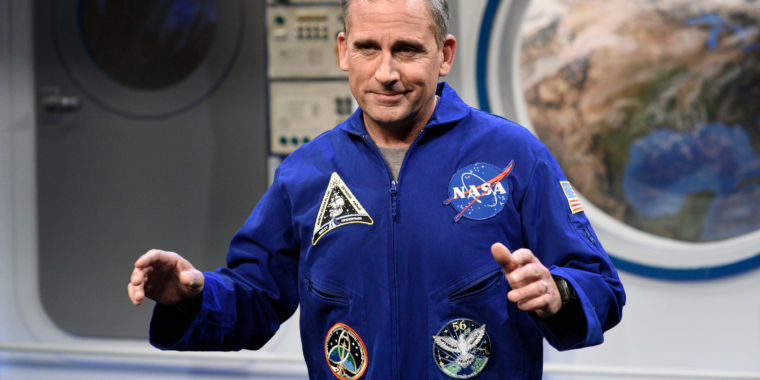 Steve Carell as Ed McGovern during a NASA-themed skit on Saturday Night Live in 2018. This is currently our best estimate of what Carell might look like on Netflix’s Space Force.Getty/Will Heath/NBC/NBCU