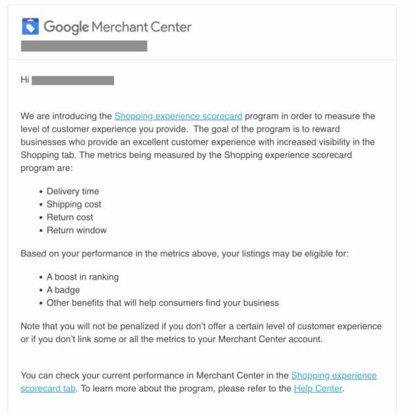 Google is notifying Google Merchant Center merchants of a new program called the Shopping experience scorecard. In short, Google is telling these merchants that if they provide an “excellent customer experience” Google will, in turn, reward those merchants with “a boost in rankings,” “a badge” and “other benefits that will help consumers find your business,” within the Google Shopping tab in Google Search.