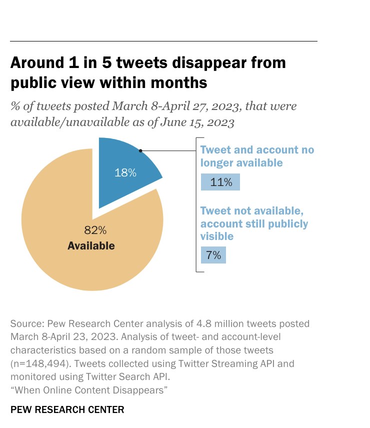 È emerso che quasi un tweet su cinque non è più visibile pochi mesi dopo essere stato pubblicato e che nel 60% dei casi l’account che originariamente aveva pubblicato il tweet è stato reso privato, sospeso o cancellato del tutto.