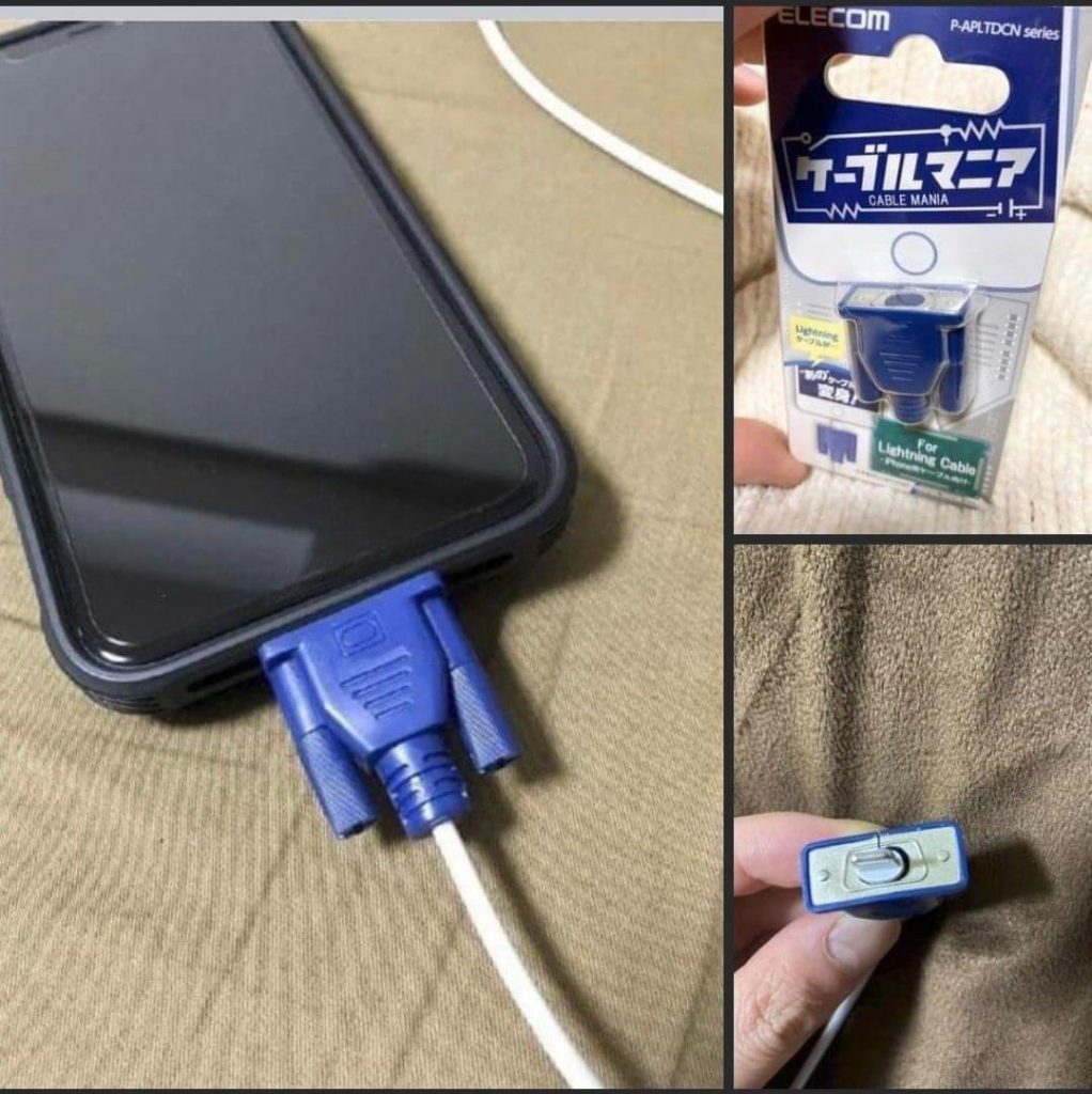 “L’umorismo in questa immagine deriva dall’assurdità di collegare un connettore VGA grande e obsoleto a una piccola e moderna porta di ricarica per smartphone”.