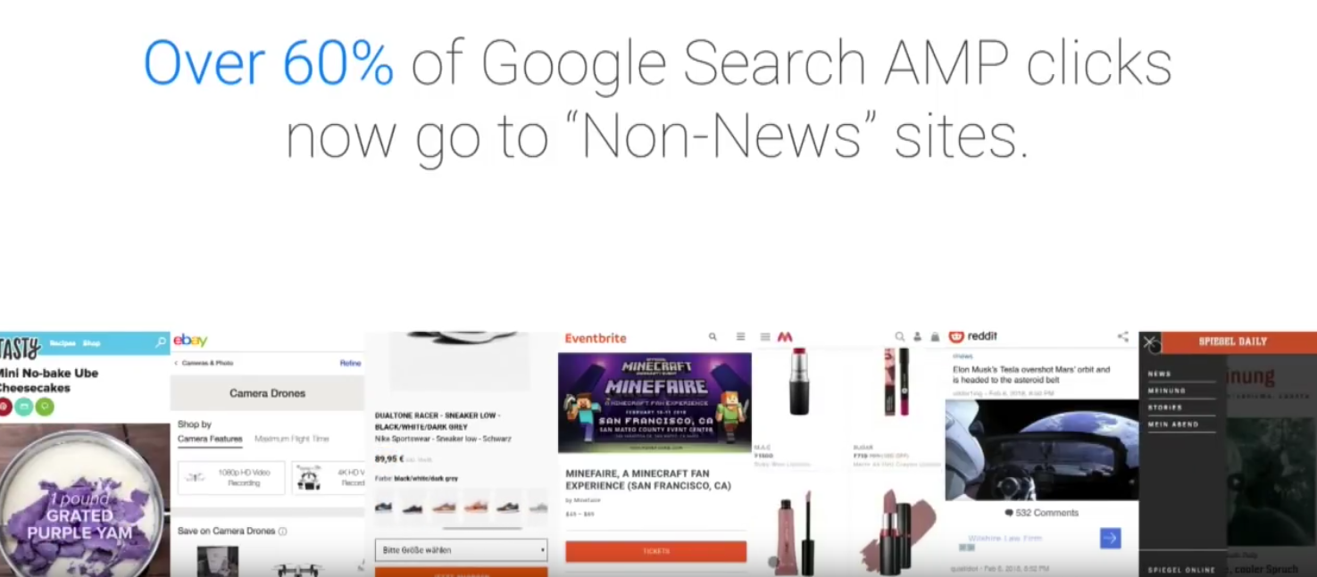 The types of publishers that have been making AMP pages have changed quite a bit since we launched. In fact, AMP is now used for recipes, travel, retail, dictionaries, RapGenius and many other use cases. In fact, over 60% of all the clicks to AMP pages in Google search go to non-news pages.