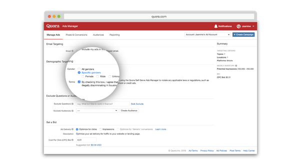 Gender targeting. If your company produces products designed specifically for men or women, this option can help you direct spend to your target customers. Quora also notes that some businesses may see improved results from messaging tailored to male and female audiences.