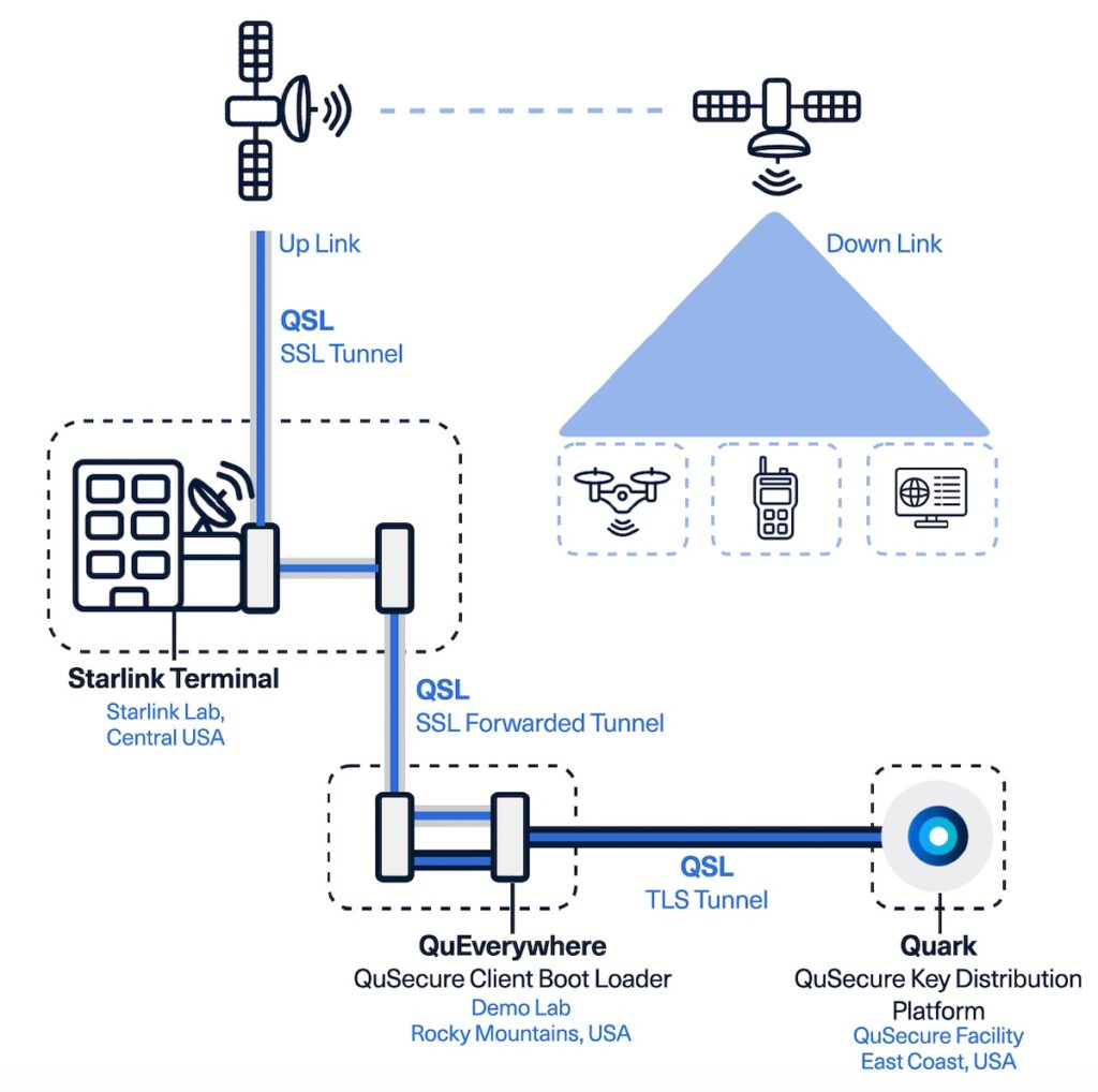 For its satellite test, QuSecure used the Starlink low earth orbit (LEO) satellite network. Quantum resilient data was sent from Quark through labs at Rearden Logic in Colorado to a Starlink terminal. From there the data was uploaded to a Starlink satellite, and then delivered via downlink back to earth.