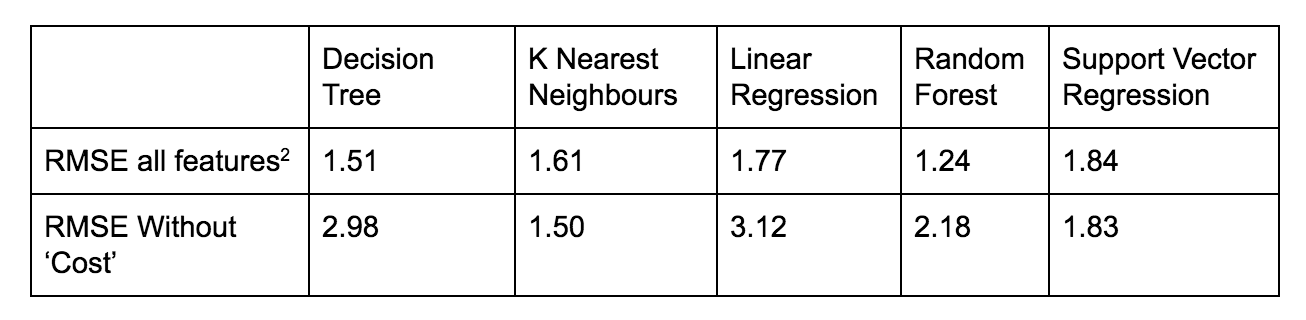 We ran five different machine learning algorithms: Decision Tree, K Nearest Neighbours, Linear Regression, Random Forest and Support Vector Regression. In most cases, removing “cost” as a feature in the data set, increased the error value by more than removing any other feature. This means that the model became less accurate at predicting the correct outcome.