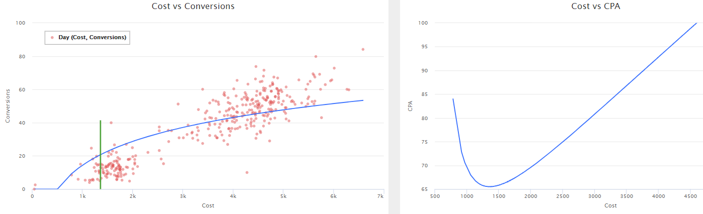 From the CPA chart on the right we identify a minimal point where CPA is lowest on the cost dimension, this is the bottom of the ‘U’ shape. This point also corresponds on the left graph (cost vs. conversions) with the green line.