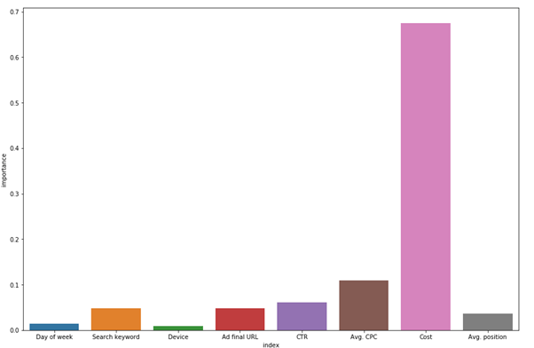We can also analyze the feature importance used by the random forest (the best model). It’s clear that cost is the key feature the algorithm is using to determine its results: