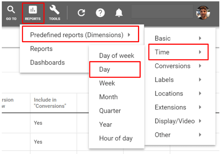 Within Google Ads, navigate to Reports >> Predefined Reports >> Time >> Day