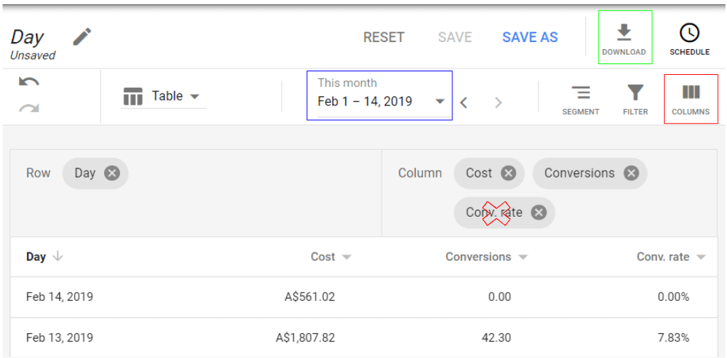 Once in the report (screenshot below), select the “columns” button (red box), then remove all columns except “Cost” and “Conversions.” Then select a date going back one year from today (blue box). lastly, download the report as an “excel .csv” file (green box).