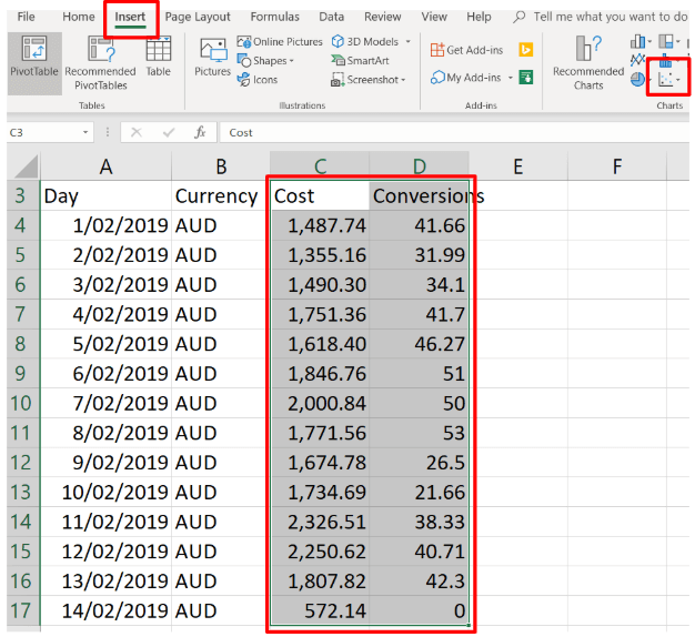 Open the excel file and select columns that contain only the “cost” and “conversions” data. In the example below, cells C3:D17. Then in the menu bar select “Insert’ >> ‘scatter graph.”