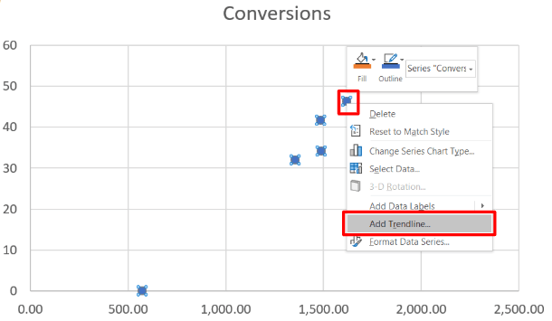 We’ve now got a beautiful scatter graph portraying “cost” and “conversions.” Generate a regression line by right-clicking on any of the data points and selecting “add trendline.”