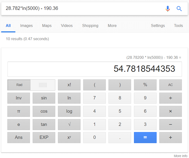 In the equation y represents conversions, and x represents “cost.” To predict y for any given x, we replace x with a real number. Let’s assume a cost of $5,000. We say y = 28.782*ln(5,000) – 190.36. Using a calculator, it comes out to 54 conversions per day.