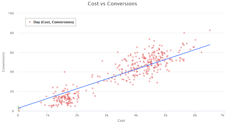 The regression line that we have just created is extremely useful. Even from a visual perspective you are now able to visualize what your expected daily conversions will be at any point of daily cost.
