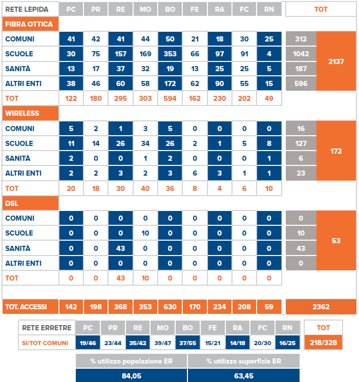 I Comuni, è specificato in una nota Lepida, sono collegati in fibra ottica in 312 sedi regionali, mentre 16 sono collegate con tecnologie radio.