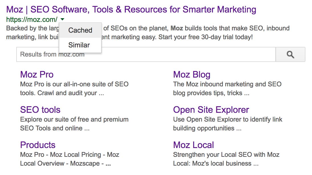 You can view what your cached version of a page looks like by clicking the drop-down arrow next to the URL in the SERP and choosing “Cached”: