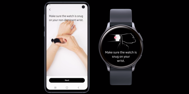 The only sensors on the back of a Galaxy Watch Active2 are a photoplethysmography (PPG) heart rate sensor and an electrode for electrocardiograms, but the company says that’s enough to obtain a blood pressure rating. The trick is that you’ll first need to calibrate the sensors with a real blood pressure cuff. The setup process has you wear the watch while taking a blood pressure reading with a cuff, then you enter the cuff reading into Samsung’s software. From there, the software can supposedly take further readings with just the watch hardware.