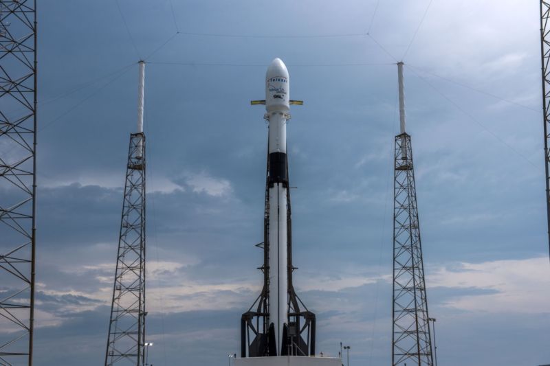 Enlarge / The Block 5 variant of the Falcon 9 rocket, on the launchpad, with its Telstar 19V payload. (credit: SpaceX)