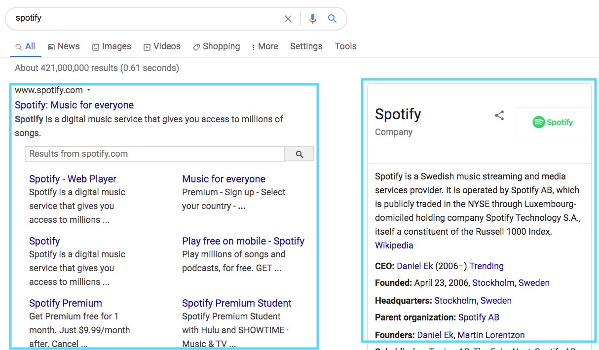 Since users with navigational intent already know which website they’re looking for, these results usually feature the most relevant page at the top: e.g. if the user searches “Spotify”, Spotify’s homepage will be the first result, whereas the login page will take first position for “Spotify login.”