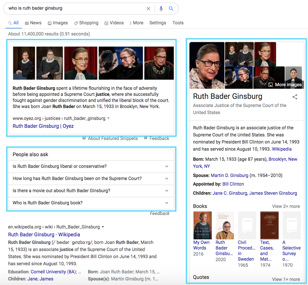 As mentioned above, informational keywords tend to own SERP results that provide condensed information. These include knowledge grabs, featured snippets, and related questions. The top results are most likely organic results, and consist of Wikipedia, dictionary, or informative blog posts.