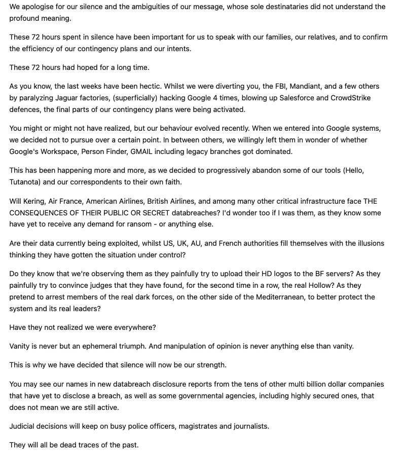 In a message posted online last week, Scattered Spider and ShinyHunters announced their retirement. A lengthy manifesto mentions recent high-profile hacks and taunts law enforcement. “Our objectives having been fulfilled, it is now time to say goodbye,” the hackers said.