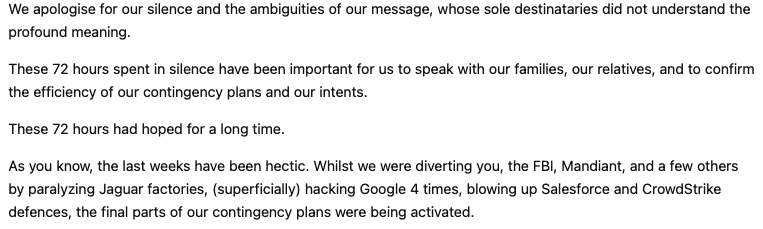 In a message posted online last week, Scattered Spider and ShinyHunters announced their retirement. A lengthy manifesto mentions recent high-profile hacks and taunts law enforcement. “Our objectives having been fulfilled, it is now time to say goodbye,” the hackers said.