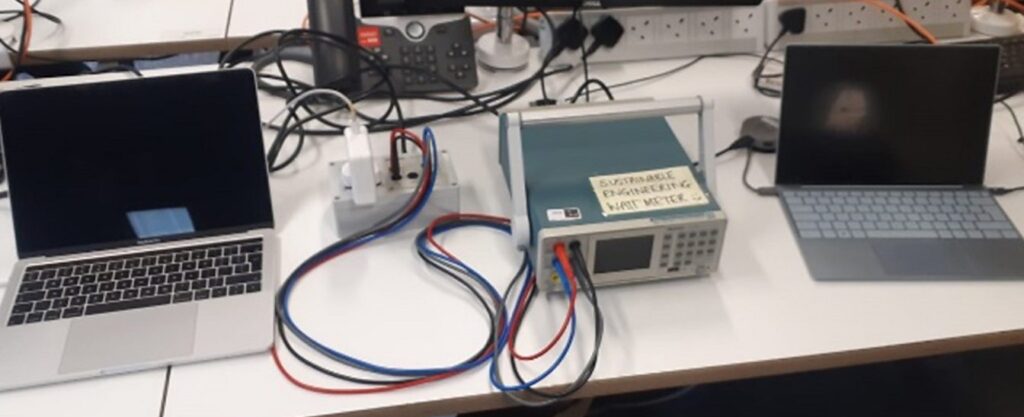 The BBC R&D team’s small-scale brightness testing setup: a power monitor, a testing laptop (with LCD screen), and a monitoring laptop. Credit: BBC