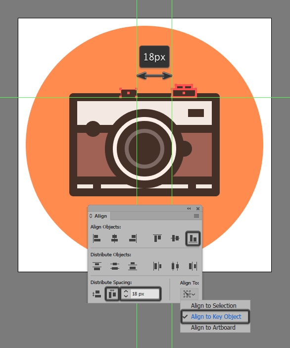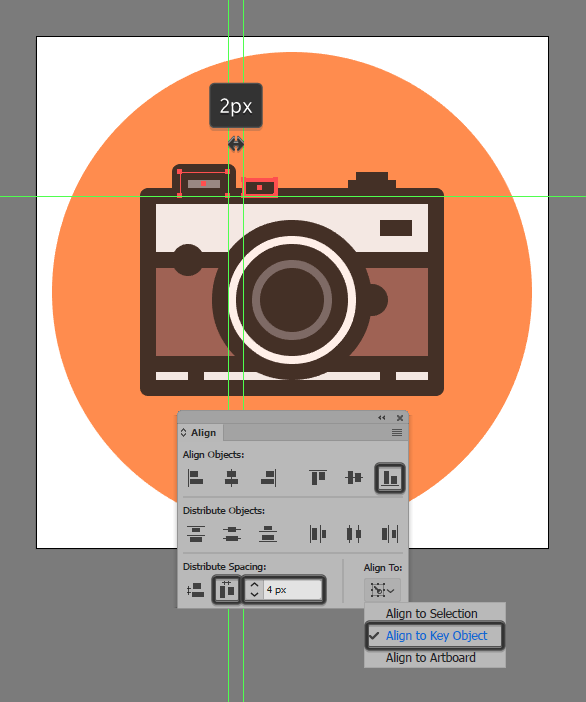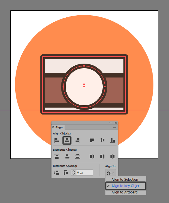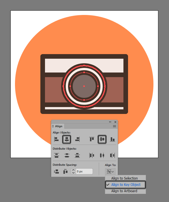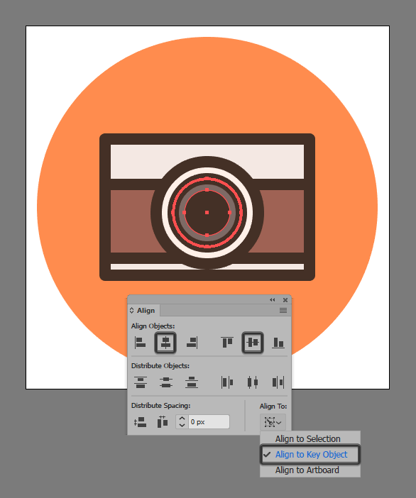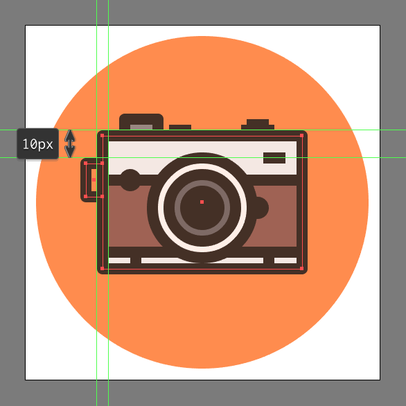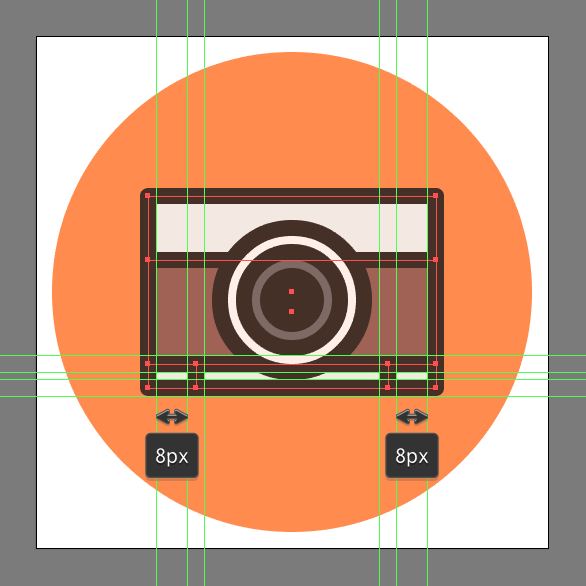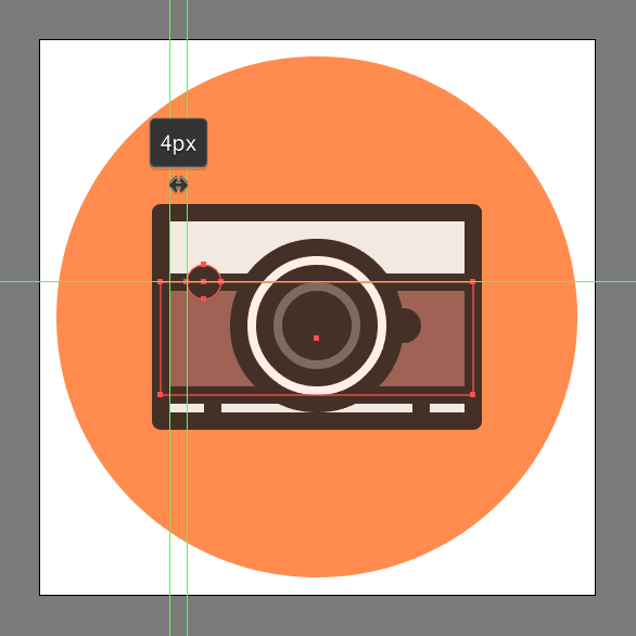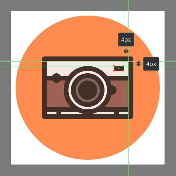 Start working on the lens, by creating a 36 x 36 px circle (#FFEFE9) with a 4 px thick outline (#422C21), which we will group (Control-G) and then center align to the camera’s body, aligning it to its outline’s bottom edge.