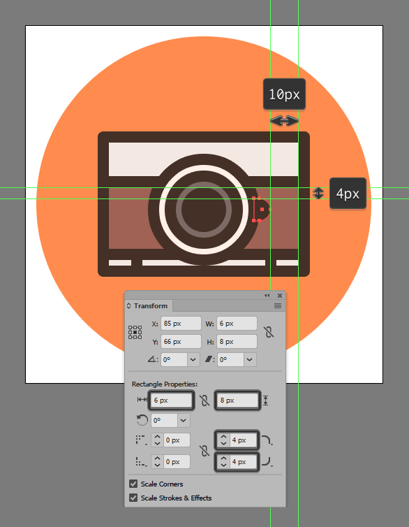 Move a few pixels back up, and add the little lens release button using a 6 x 8 px rectangle (#422C21), which we will adjust by setting the Radius of its right corners to 4 px from within the Transform panel’s Rectangle Properties. Once you’re done, position the resulting shape onto the right side of the lens, at a distance of 4 px from the top edge of the leather section’s outline.