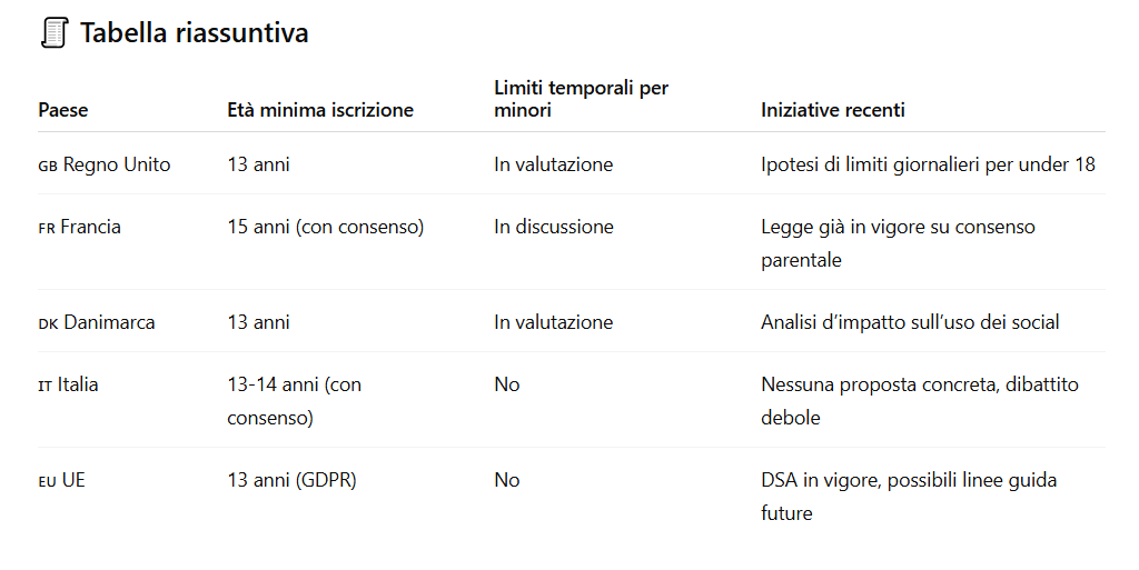 - Danimarca: il governo ha chiesto una valutazione d’impatto sull’uso dei social nei giovani, in vista di possibili limiti orari e regole più severe per TikTok e Instagram.