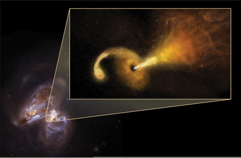 Enlarge / The galaxy merger, with an artist’s representation of a star being drawn into a black hole. (credit: Sophia Dagnello, NRAO/AUI/NSF; NASA, STScI)