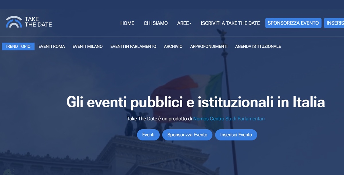 Un portale per seguire e promuovere gli eventi pubblici e istituzionali che animano il dibattito italiano. Si chiama Take The Date il nuovo grande database realizzato da NOMOS Centro Studi Parlamentari, che raccoglie migliaia di convegni, conferenze stampa, eventi istituzionali, presentazioni e appuntamenti di approfondimento, promossi da istituzioni, aziende, associazioni, fondazioni e think tank.