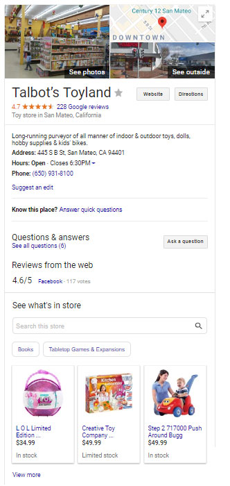 Miriam: I was fascinated to learn that Pointy is the launch partner for Google’s See What’s In Store feature, and readers can see an example of this with Talbot’s Toyland. Can you explain what’s involved for retailers who want their inventory to appear in the SWIS area of the Google Business Profile (aka “Knowledge Panel”) and why this represents such an important opportunity? Also, does the business have to pay a commission to Google for inclusion/impressions/clicks?