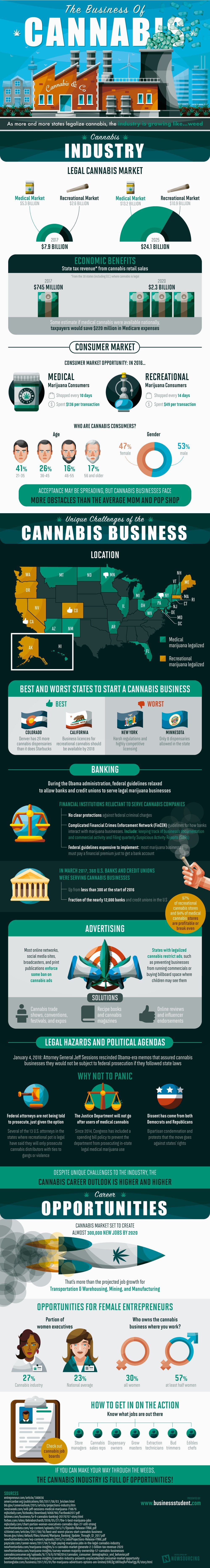 There are a number of ways to get started in the cannabis business. To learn more, check out BusinessStudent.com’s infographic below.