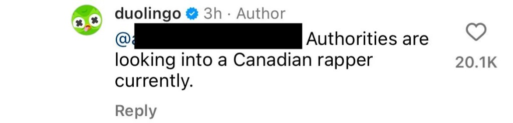 In the comments under Duo’s obituary, Duolingo said authorities were currently “looking into a Canadian rapper.”