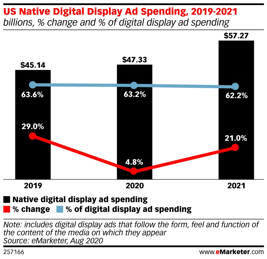 According to eMarketer, $47.33 billion will be spent on native ads in 2020 — a 4.8% growth spurt. They expect native ad spend to grow by 21% as digital ad spend recovers next year.