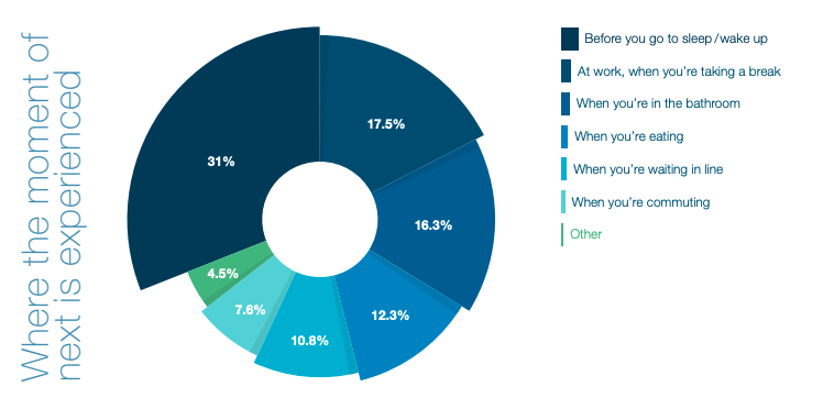 A follow-up study from Nielsen revealed that these moments occurred most often as we were on our way to bed or just waking up, taking a work break, or using the restroom. Lunch breaks, lines, and commutes had been deprioritized.