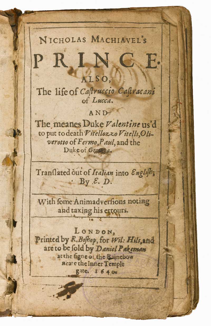 The Prince was not translated into English until the end of the sixteenth century. The first printed English edition appeared in 1640 in a very small (duodecimo) format, measuring just 14.5 x 8 cm and printed in London by Richard Bishop (fl. 1636–54).